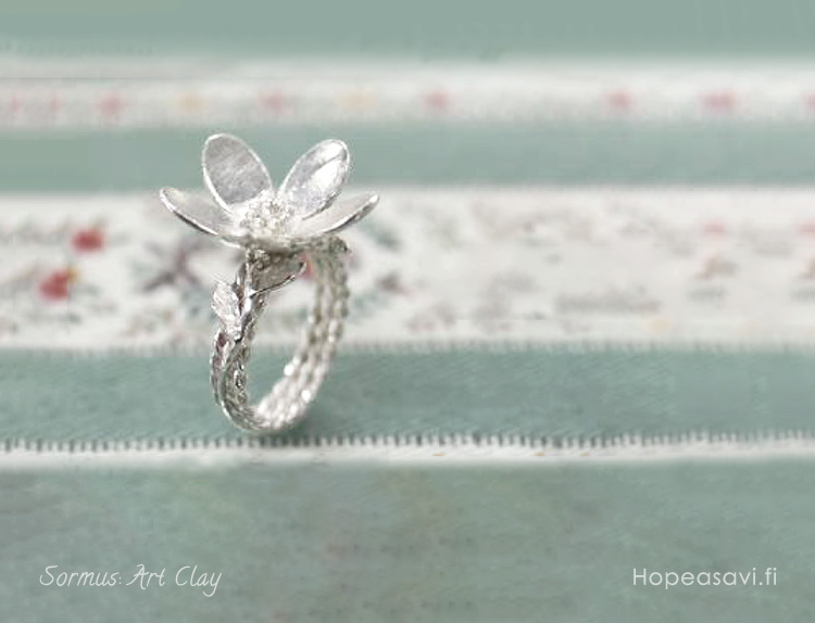 8. Kauli 5gr Art Clay hopeasavea 1mm paksuksi levyksi käyttäen 1mm välilistoja tukena. Leikkaa kukan terälehdet omalla leikkurilla (i).