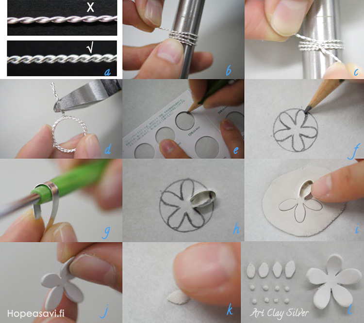 6. Tee oma muotoleikkuri hopea 999 nauhasta. Taivuta pätkä hopeanauhaa kukan terälehden muotoon esim. pyöreän työkalukahvan avulla (g) ja leikkaa tarvittaessa ylimääräiset palaset pois.