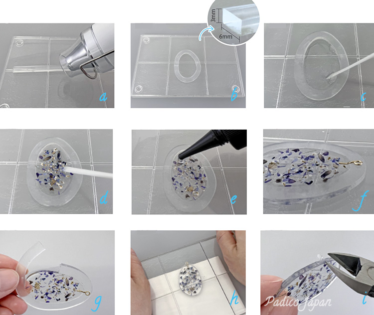 1) Lämmitä reunusmuottinauhaa hiustenkuivaajalla (matala lämpöasetus) niin että nauha pehmenee (a). Huomaa: kuvassa on käytetty embossaus lämpöpuhallinta. 2). Muotoile reunusmuottinauha vapaasti ja aseta se tukevasti kirkkaalle työalustalle joka kuuluu samaan settiin. Muotti on nyt valmis käyttöön (b). 3) Laita ohut kerros hartsia koko muotin sisäalueelle (c). 4) Aseta kuivattuja kukkia tasaisesti hartsiin (d) Huomaa: vältä laittamasta liiian paksua geelikerrosta 5) Koveta UV Led valossa valmistajan ohjeiden mukaan. 6) Laita lisää hartsia muottiin niin että muotti on täynnä reunaan asti (e). 7) Aseta hartsiin silmukka. Vinkki: silmukan voi tehdä metallilangasta. 8). Koveta hartsi molemmilta puolilta täysin kovaksi. 9) Kun hartsi on jäähtynyt irrota ensin koru alustalta ja irrota sitten reunusmuotti (g). 10) Kun työ on vielä lämmin voit painaa sitä tarvittaessa voimakkaasti tasaista alustaa vasten suoristaen näin mahdollisen epätasaisuuden. (h). 11) Jos tarpeen, poista reunoista ylimääräiset leikkurilla (i). 12) Liitä välirenkaat ja korvakoruosta ja koru on valmis.