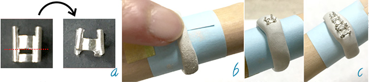 2. Muotoile 5g Art Clay hopeasavea pötköksi ja aseta puukapulalle (b).